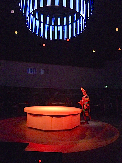 Dans la dernière salle, le pavillon Japonais offre un spectacle virtuel, qui imagine le restaurant du futur. Chacun des invité s’assoie autour d’une table connecté, devant vous avez des baguettes qui vous aideront à choisir vos plats sur écran/tablette.