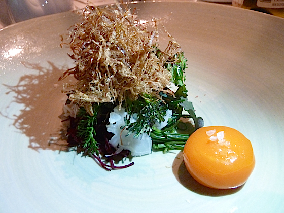 Un poulpe confit, viande séchée, viande séchée, jaune d’oeuf et carotte coulante….