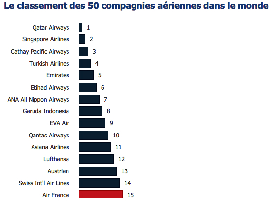 On aurait bien aimé que Air France soit mieux classé dans le classement Skytrax qui a noté les meilleures compagnies aériennes au niveau mondial pour ce qui est de la qualité de leurs prestations, finalement ils arrivent 15 éme malgré leur montée en gamme. Une performance vu le retard accumulé en termes de service et de satisfaction client depuis de nombreuses années, et les grèves à répétitions.