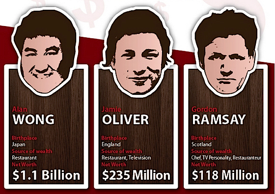 Il est intéressant de voir qu’un chef comme Paul Bocuse n’est pas la liste ci-dessous, mais il est souvent cité comme l’un des plus riches chefs au monde avec une richesse estimée à plus de 100 millions de dollars révèle l’article, de même pour le chef Robuchon qui est aujourd’hui plus actif dans les affaires que le chef Ducasse.