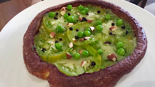 Tout est résumé, la pascade sert de récipient, la carte s’articule autour de ces préparations étonnantes qui garnissent ces crêpes aveyronnaises. Celle-ci était garnie de risotto vert au basilic et parmesan, de green tomate fraîches, de petits pois et d’amandes croquantes. C’était frais, gouteux et fondant à souhait, simple et en même temps recherché.