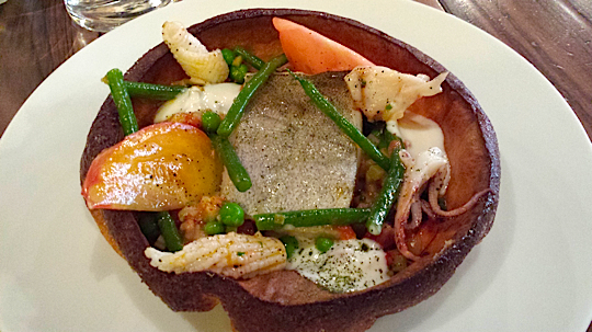 Celle-là, se composait d’un filet de lieu parfaitement cuit relevé d’un condiment fraise/rhubarbe, de petits calamars grillés, d’haricots verts, de tranches de tomates » coeur de boeuf » et d’un yaourt amande. C’était généreux, facile à manger et puis tellement original.