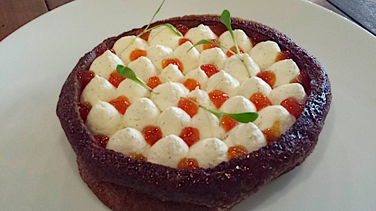 Toute seule la Pascade est un régal, souple et en même temps croustillante, légèrement douce sur sa croûte en surface, c’est nature relevé d’un léger parfum de truffe que nous avons entamé le repas. Une petite dizaine de minutes pour la cuire, elle arrive encore fumante sur la table, sa forme fait tout de suite penser à une assiette… Il n’en fallait pas plus à Alexandre Bourdas pour l’imaginer garnie de succulentes préparations.