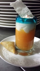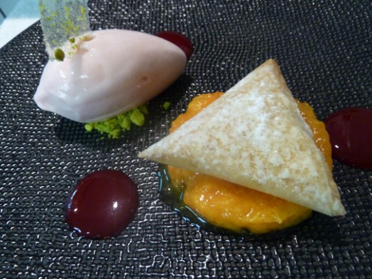 Samoussa d’abricots, compoté d’abricots et sorbet légèrement parfumé à la rose.