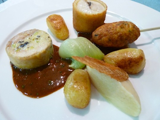 Autour de la volaille blanche : le blanc en viennois aux truffes blanches, la cuisse en ballottine vapeur aux champignons, la kefta aux épices, pommes grenailles, jeunes blettes, jus de poulet façon « diable ».