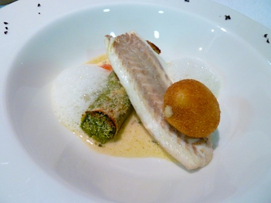 Le filet de bar au four, cannellonis de courgette aux coquillages (moules, coques), jus au thym, croquette coulante de brandade de morue.