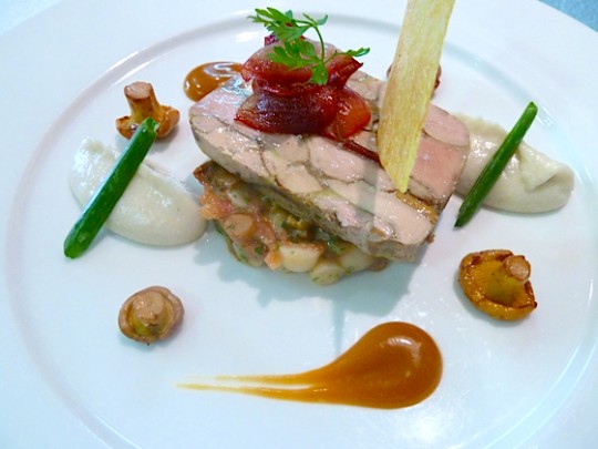 La salade de haricots coco aux girolles, marbré de foie gras de canard au pain d’épices, amandes fraîches, purée de coco, coulis d’abricot et oignons aigre doux.