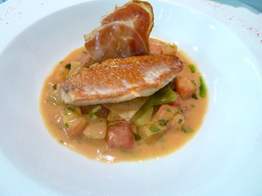 Les filets de rouget grillés et sa marmelade de ricotta aux pignons de pin, croustillant à la menthe, fraicheur de tomate relevée d’orange, copeaux de jambon poêlés.