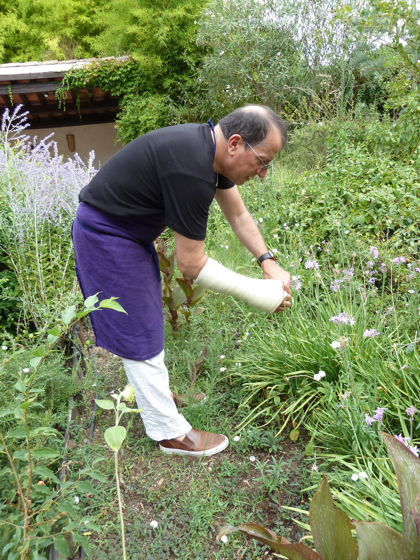 Ramassage des fleurs et herbes dans le jardin du Jardin des Sens… seul Alain Caron à su comment les trouver !