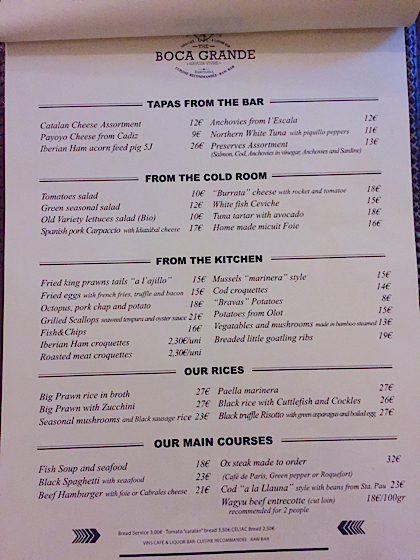 Une des adresses chics et finalement assez confidentielles, c’est Boca Grande, tout près des Ramblas, en plein coeur de ville, c’est une toute bâtisse bourgeoise entièrement dédiée à la restauration, sur trois niveaux, cet établissement ouvert en 2012 est devenu le rendez-vous de toute une clientèle festive et haut de gamme. L’enseigne annonce le programme » Boca Grande – Savoir Vivre « , étonnante référence au français.