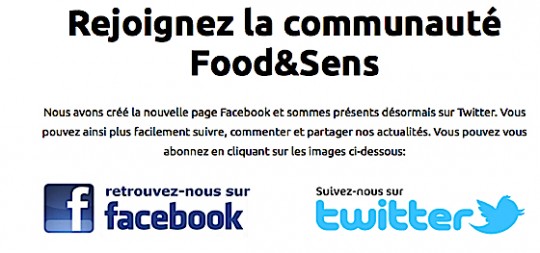 Vous pouvez aussi dès à présent suivre Food&Sens sur les réseaux sociaux, sur sa page Facebook et sur Twitter, ainsi retrouvez les liens des posts, mais aussi les inédits qui vont animer la toile.