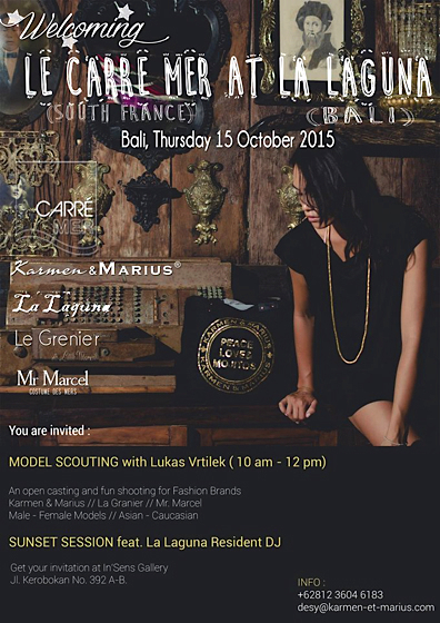 Olivier Château sera présent au nouveau restaurant – La Laguna – à Séminyak pour une soirée de promotion « Carré Mer » le restaurant plage des frères Pourcel à proximité de Montpellier, et la marque française Karmen & Marius. Coucher de soleil sur la plage de Séminyak pour un évènement totalement » Gypset « , Dj, cocktail et et présentation d’accessoires de mode.