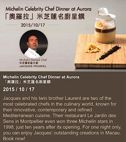 Jacques Pourcel sera aux fourneaux du restaurant Aurora de l’hôtel Altira à Macau pour un prestigieux dîner mettant à l’honneur la cuisine gastronomique des frères Pourcel. L’occasion de revoir quelques amis chefs sur place et de terminer par une nuit au club de l’hôtel avec le DJ montpelliérain Maxime Laffon ( https://soundcloud.com/maximelaffon )