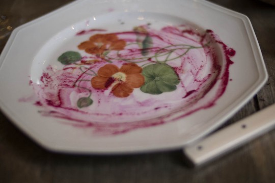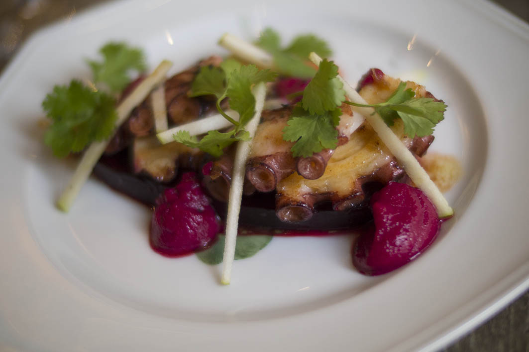 « J’ai du mal à limiter les portions », avoue Patrice — on est philanthropique ou on ne l’est pas. C’était déjà le cas à Youpi & Voilà et ça n’a pas changé, même s’il affirme se soigner. Le poulpe grillé, betterave crapaudine, crème de betterave vinaigrée et pomme Granny Smith arrive tiède, la parfaite température pour ces ingrédients. Un bel équilibre entre douceur, acidité et la saveur marine du poulpe cuit tendre et légèrement grillé. Une entrée généreuse, qui pourrait être un plat.