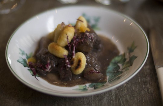 Intermède proposé par le chef : une petite assiette de civet de lièvre aux gnocchis poêlés. Patrice joue avec bonheur sur tous les registres : cuisine fine et inventive, accords inattendus, gibiers et mijotages intemporels.