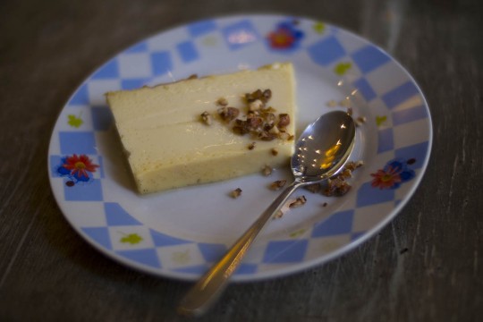 Flan aux œufs garni de fruits secs hachés. Patrice est pâtissier-confiseur de formation ; sa préférence va aux desserts de grand-mère, qu’il réussit fort bien.