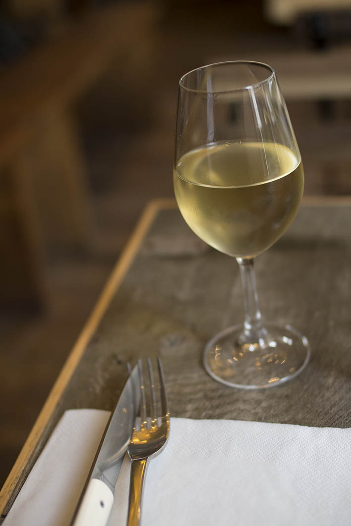La salle est belle, on s’y sent bien. La double exposition produit une superbe lumière ; l’espace est ample et chaleureux, simplement décoré par les étagères de bouteilles.