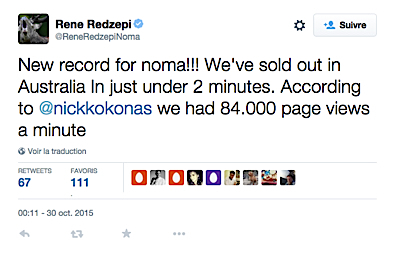 Le chef du Noma se relance dans la même aventure durant 10 semaines à partir du mois de janvier prochain, il posera ses équipes à Sydney, il va proposer une cuisine créative avec les produits d’Australie. Hier il a lancé les réservations par internet, 5600 places étaient mise en vente, le prix par personne du menu s’élevé à 485 dollars australiens, soit environ 313 euros auxquels il faudra ajouter les taxes et les vins que vous allez choisir.