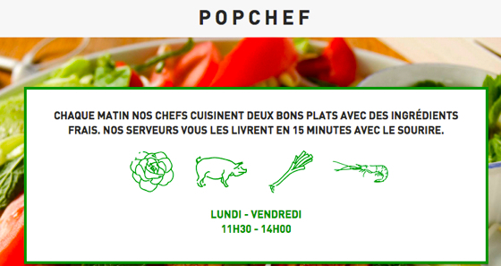 PopChef (pour le déjeuner) ou de FoodChéri (pour le dîner) qui veulent devenir un nouveau réflexe pour les jeunes urbains : chaque jour, ces deux start-up proposent deux plats au choix, à petits prix, livrés à domicile en moins de 20 minutes