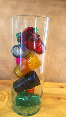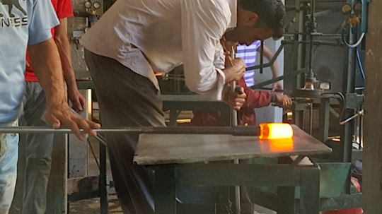 Les verres, soufflés à la bouche, sont coupés artisanalement à la flamme d’oxygène et de gaz. Les débris repartent à la fusion, tandis que les verres sont placés dans un four de recuite pendant 3 h. Ils sont ensuite lavés et acheminés sur un chariot par rail jusqu’à leur lieu de stockage.