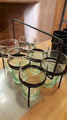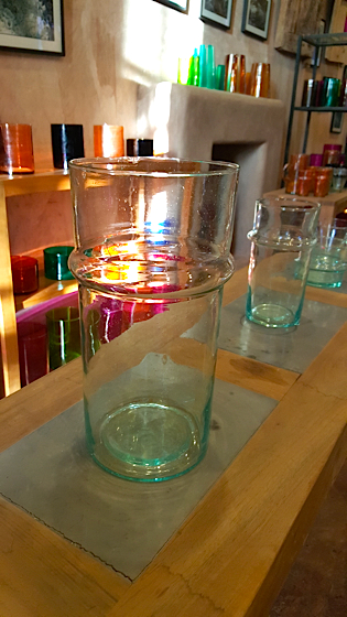 Les propriétaires ont eu la bonne idée de faire renaître une fabrique de verre » Beldi « , ces verres qui à l’origine servaient à contenir le fameux thé à la menthe. C’est le verre traditionnel, ceux que l’ont trouvait partout à Marrakech, avant que petit à petit il disparaissent pour laisser la place à des verres industriels.