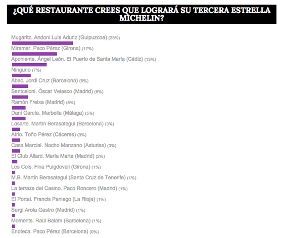 Le site espagnol 7 Canibales, un des médias en ligne les plus populaires dans l’univers de la restauration a lancé un sondage sur son interface auprès du grand public pour savoir quel chef est le mieux placé pour l’obtention de la 3 éme étoile, mais aussi de la 2 éme et de la 1 ère.
