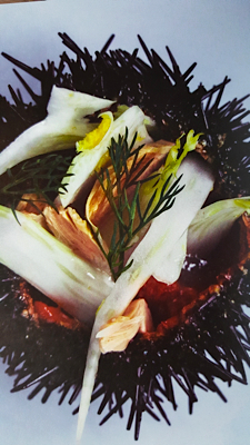 Elles sont toutes en sensibilité. Dans le chapitre sur le Désir, on découvre une recette qu’Eric Guérin qualifie de genèse de sa cuisine, son premier plat signature, la rencontre insolite entre un canard et une sardine à la fleur de sel. Dans la Joie l’oursin, la pomme et le citron filent le parfait chemin sur une route qui longe les côtes françaises et court jusqu’à l’Italie. Dans la Volupté le homard ne craint pas la burrata brûlée, dans l’Amour le chou-fleur jaune de safran fait le beau devant l’huitre….