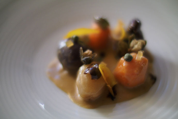 Rappelons l’essentiel sur Mauro Colagreco : cuisinier d’origine argentine aux racines italiennes, doublement étoilé et joliment placé dans la liste des 50Best, ex-Passard boy replanté entre Riviera et Côte d’Azur dans son restaurant Mirazur à Menton, à cheval sur la frontière italo-française ; voilà pour le who’s who. Un style très individualisé, inspiré, généreux, poétique ; une cuisine latine, ouverte au monde, arc-en-ciel, nourrie d’influences sud-américaines et méditerranéennes. Je n’ai pas employé le terme « replanté » par hasard, car avec Mauro, on pense toujours à la botanique, au fruit, à la fleur, à la luxuriance. Je ne parle pas seulement du magnifique potager que Mauro cultive chez lui à Menton, mais aussi du charme agreste de ses assiettes, de sa façon de traiter le végétal comme une œuvre d’art. À chaque fois qu’on s’approche de l’univers de Mauro, quelque chose de magique n’est pas loin. Ces quelques images d’un repas à Mirazur, je crois, en témoignent.