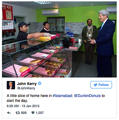 Mais ce que l’on sait moins c’est que le secrétaire d’état américain est totalement fan de la chaîne de beignets Dunkin’ Donuts, d’ailleurs lorsqu’il voyage partout dans le monde il se renseigne pour savoir si il y en a dans le pays où il se trouve.