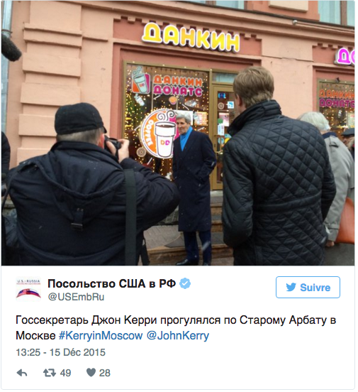 C’est sur les réseaux sociaux que l’on peut remarquer que l’une des personnalités les plus importantes des États-Unis d’Amérique, n’hésite pas à se rendre dans les endroits les plus incroyables pour aller chercher ses beignets. Il était d’ailleurs hier à Moscou pour des entretiens politiques avec Vladimir Poutine, il a été aperçu entre deux réunions devant la boutique de beignets de la chaine américaine ( ci-dessus ).