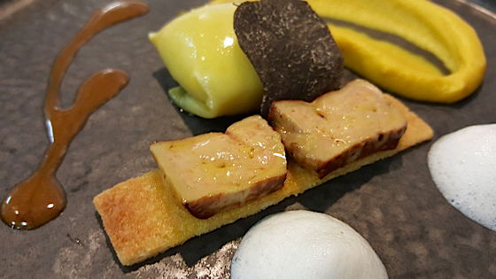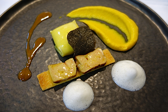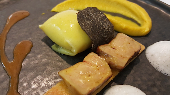 Disposez délicatement sur chacune des assiettes les ravioles, la purée de potimarron. Accompagnez le tout de la tartine de foie gras, et de quelques lamelles de truffes. Terminez avec le jus de rôti, l’écume de lait et une pointe de fleur de sel sur le foie gras.