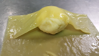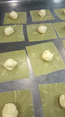 Disposez au centre de chaque feuille de pâte une boule de pomme de terre, enfermez le tout comme sur les photos. Débarrassez les petits raviolis sur une plaque inox huilée, recouvrez de papier filme.