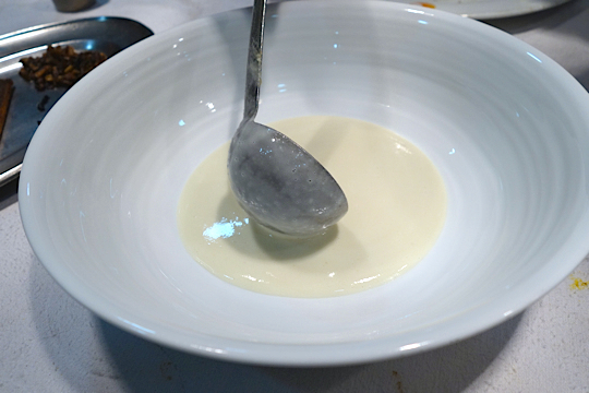 Mélangez tout les ingrédients, faites chauffer le tout, puis mixez et assaisonnez. Passez au chinois, gardez au chaud sur le coin du fourneau.