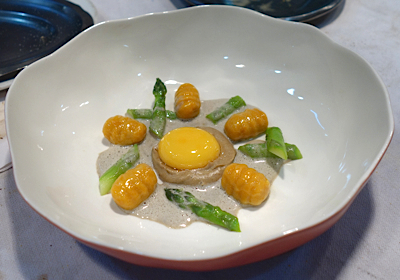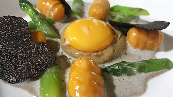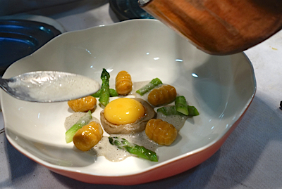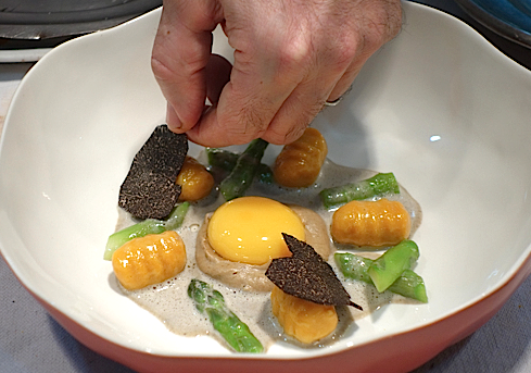 Au centre des assiettes déposez une cuillère de purée de champignon, posez dessus délicatement le jaune d’oeuf tiède, déposez quelques grains de fleur de sel dessus. Tout le tour déposer les gnocchis et les asperges, arrosez avec le beurre de truffe qui vous a permis à réchauffer les gnocchis.