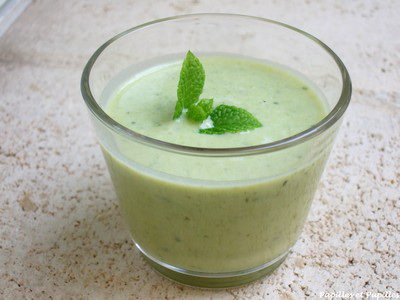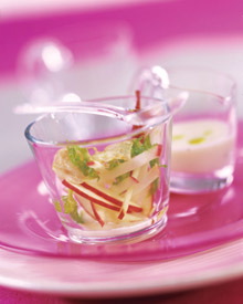 Soupe au lait de coco et yaourt, brochettes d’ananas au caramel.