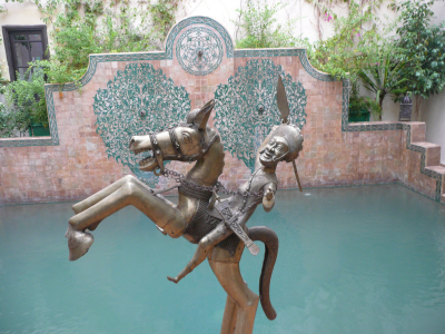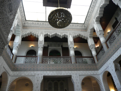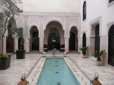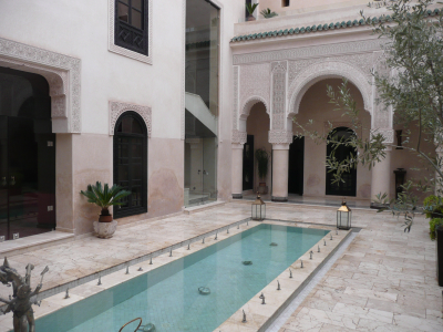En insistant un peu, on nous permet de visiter, l’endroit est remarquable nous apprenons que le riad est classé, les différentes pièces se succèdent, toutes aussi belles les unes que les autres. Les sculptures traditionnelles se fondent dans un environnement moderne, tout est de bon goût, l’ambiance est calme, presque zen…