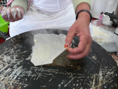 Réalisation des feuilles de Brick. La dame prend à la main une pâte presque liquide qu'elles colle d'un geste précis sur une plaque chaude, laissant juste une fine pellicule de pâte.
