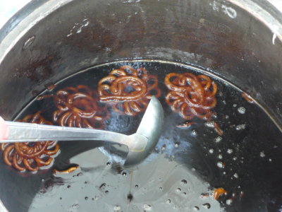 D'un entonnoir ils laissent couler une pâte, avec laquelle ils dessinent dans l'huile chaude une sorte de rosace