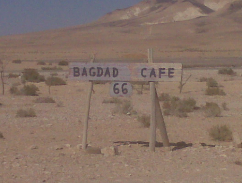 Nous nous arrêtons au Bagdad Café 66 pour faire une pose, le long de la route plusieurs Bagdad café ponctuent le désert, ce sont à chaque fois des lieux d’escales destinés aux touristes, le cadre est agréable… à l’intérieur, ça fait un peu supermarché….