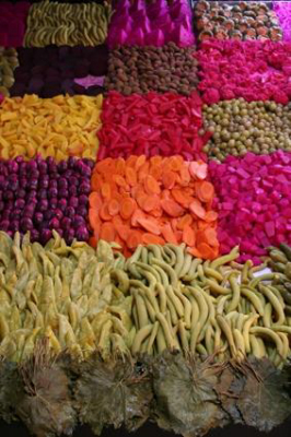 Tout de suite après nous plongeons à nouveaux dans les souks, les rues sont interminables, un dédale de ruelles qui grouillent de monde à cette heure de fin d’après midi. Tout le long des comptoirs, les fruits confits et les fruits secs s’étalent offrant leur belles couleurs formant comme un patchwork.