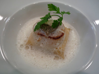 Émincé de noix de saint-Jacques raviole coulante de maïs à l’émulsion de truffes