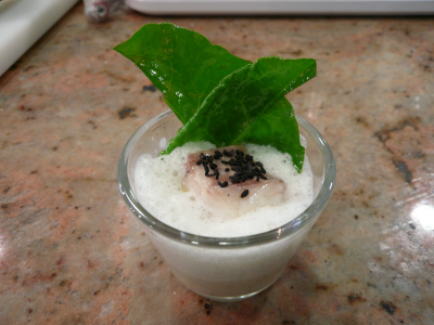 Fine purée de coco à la vanille, loup tiède, émulsion de lait fumé, salade d’oseille