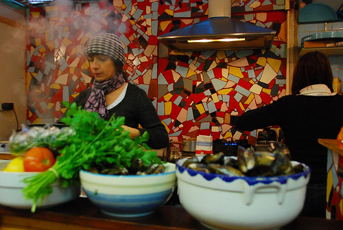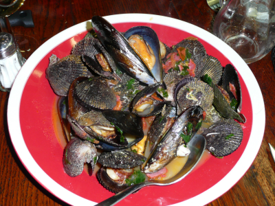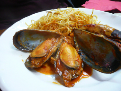 Un quart de vin blanc à la tireuse, et nous voila parti pour un festival de saveurs, donc quelques oursins frais, un fricassée de moules et pitchilines au jambon, des moules farcies, des filets de rougets à la tapenade avec un gratin de macaronis et des légumes au citrons confits, et quelques crêpes pour terminer le tout….
