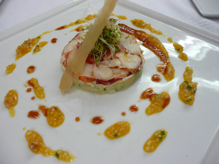 L’émincé de homard, pommes de terre acidulée, vinaigrette au jus de passion et perles du japon