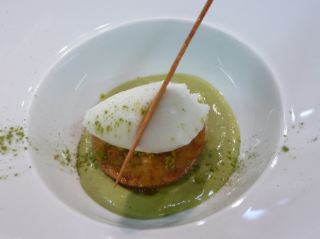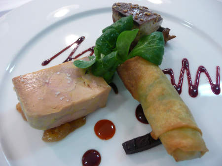 Déclinaison de foie gras, en nems, en terrine et poêlé, sirop de betteraves.