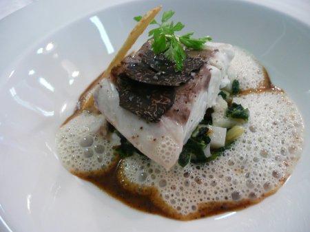 Filet de loup cuit au four, quelques blettes et céleris, jus de viande aux truffes, truffes fraîches.