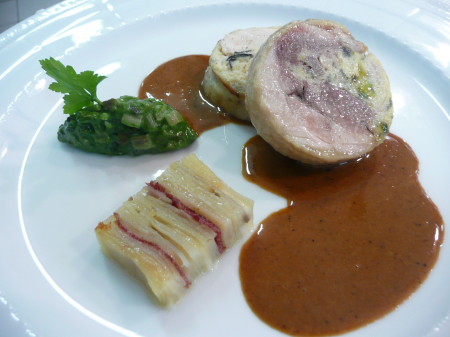 Le chapon : le filet roulé aux truffes, la cuisse farcie aux pistaches.