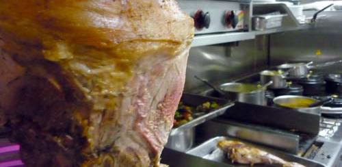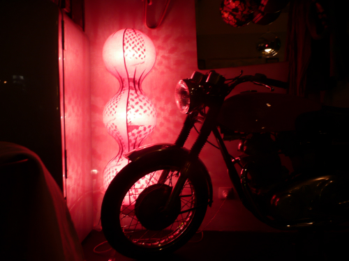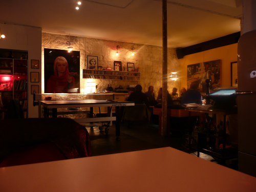 Ici pas de chichi, on est cool, on se lève pour taper une balle sur la table de pong-ping, on monte à l’étage fumer dans une des chambres à laquelle on accède en traversant une armoire, on prend son assiette et on va manger sur au lit dominé par les miroirs du plafond…. lumière tamisée, cuisine ouverte où un jambon tourne sur une broche à kébab, les objets ont été choisis avec goût par des connaisseurs c’est évident…. les photos et les toiles accrochés aux murs sont de qualités, on sent un oeil avisé.
