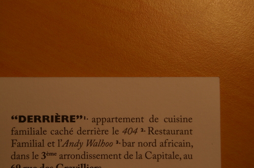 « Derrière « . 1- appartement de cuisine familiale caché derrière le 404. 2- Restaurant Familial et l’Andy Walhoo. 3- bar nord africain, dans le 3éme arrondissement de la Capital, au 69 rue des Gravilliers.