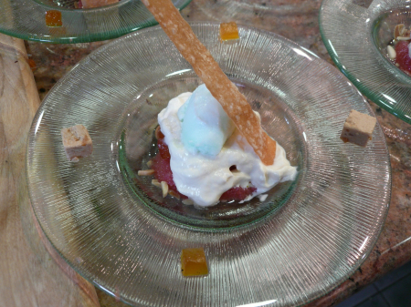 Disposez sur chaque assiette les suprêmes de pamplemousse en rosace. Une cuillérée d’écorce confite préalablement égoutter au centre, recouvrir avec l’Espuma de et déposer une quenelle de sorbet sur un croustillant. Décorer avec quelques dés de turón et d’amandes effilées et grillées.
